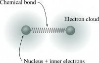 The bond between atoms shares the same qualitative characteristics. Up to a point, it also shares the same quantitative characteristics. That is, a good model for the interaction between two atoms is two balls, which represent the dense nuclear core surrounded by the inner electrons, and spring between them, which represents the chemical bond due to the shared outer electrons (Figure to the left).