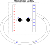 Oftentimes in circuits, we are less concerned with how the electrons in circuits are produced and are more concerned with what happens to the charges after they are produced. This means we will generally simplify our model of the battery to what we call a “mechanical model” of the battery. In this model, the battery consists of two charged plates, one that is positive and one that is negative, with a conveyor belt that pulls the electrons from the positive plate to the negative plate. In this model, the conveyor belt represents the chemical reaction in the battery that maintains the separation of charge.