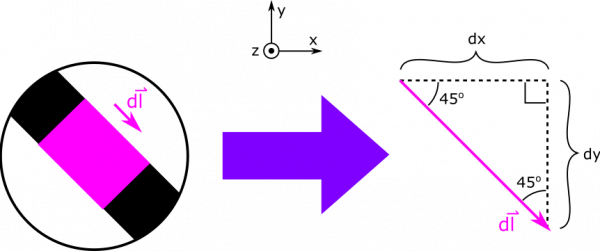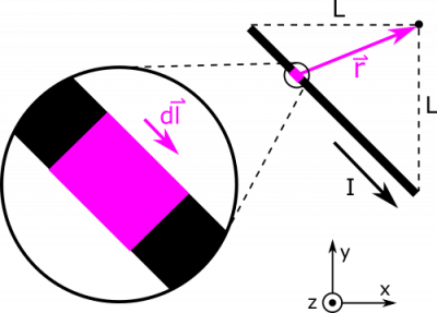 We can use geometric arguments to say that $\text{d}y=\text{d}x$. See the diagram above for an insight into this geometric argument. We can now plug in to express $\text{d}\vec{l}$ and $\vec{r}$ in terms of $x$ and $\text{d}x$: $$\text{d}\vec{l} = \langle \text{d}x, -\text{d}x, 0 \rangle$$ $$\vec{r} = \langle -x, L+x, 0 \rangle$$ Now, we can take the cross product and find the magnitude of the $\vec{r}$: $$\text{d}\vec{l} \times \vec{r} = \langle 0, 0, \text{d}x(L+x) - (-\text{d}x)(-x) \rangle = \langle 0, 0, L\text{d}x \rangle = L\text{d}x \hat{z}$$ $$r^3 = (x^2 + (L+x)^2)^{3/2}$$ The last thing we need is the bounds on our integral. Our variable of integration is $x$, since we chose to express everything in terms of $x$ and $\text{d}x$. (Earlier we could have equally have chosen to write everything in terms of y and dy though.) We know that our segment begins at $x=-L$, and ends at $x=0$, so these will be the limits on our integral. Below, we write the integral all set up, and then we evaluate using some assistance some Wolfram Alpha. \begin{align*} \vec{B} &= \int \frac{\mu_0}{4 \pi}\frac{I \cdot d\vec{l}\times \vec{r}}{r^3} \\ &= \int_{-L}^0 \frac{\mu_0}{4 \pi}\frac{IL\text{d}x}{(x^2 + (L+x)^2)^{3/2}}\hat{z} \\ &= \frac{\mu_0}{2 \pi}\frac{I}{L}\hat{z} \end{align*}