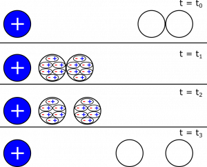 We show the analogous “induction with insulators” with a step-by-step representation below. We knew from the facts that electrons cannot move freely between insulators, which is one of the key differences between insulators and conductors. At time $t=t_0$, both of the insulating balls start out as neutral. At time $t=t_1$, when the connected balls are moved close the charged object, the atoms in the insulators would polarize, but the electrons are not free to move further or to move from one ball to the next. This means when the insulating balls are separated at $t=t_2$, there are two polarized but overall neutral balls. As the balls are pulled farther away from the positive charge, they become less and less polarized, eventually returning to the same state that they were before at $t=t_0$ (neutral, not polarized).