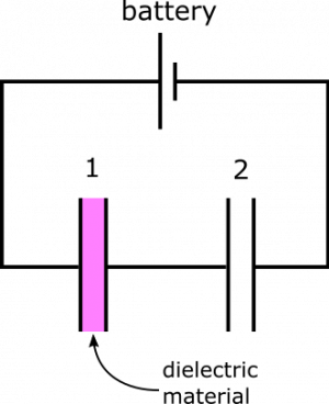 Now we need to consider what happens when we insert a dielectric. It might look something like the circuit to the right. A description of what a dielectric does in a capacitor is here. Its effect on capacitance is: $$C =\frac{k\epsilon_0 A}{d}$$