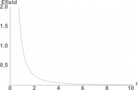 Because electric field is a vector quantity, it can be difficult to graph. Generally, we get around this by choosing a path and graphing the magnitude of the electric field vs distance along that path (the other option being to make three graphs, one for each vector component of the field). For any path moving away from a charge, we graph the magnitude of $\vec{E}$ vs the position away from the charge ( r ). In this case, $|\vec{E}|=\frac{1}{4\pi\epsilon_0}\frac{q}{r^2}$ because the separation between the point charge and where we are calculating the field is given by r along our path. This gives us a graph that is very similar to a $y=\frac{1}{x^2}$ graph, which shows that as you get closer to the charge, the magnitude of the electric field gets incrementally bigger. Eventually, the electric field gets infinitely large if you get extremely close to the charge. Likewise, the electric field rapidly gets smaller as you move away from the charge, but doesn't actually reach zero until you are infinitely far away.