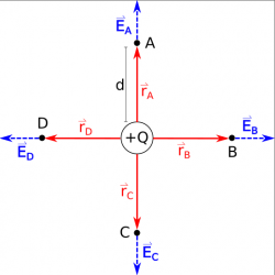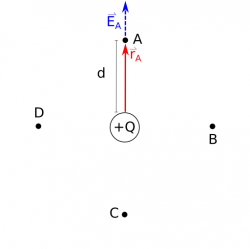 All we need now is to find the separation vector $\vec{r_A}$, which will help us find the magnitude $r_A$ and unit vector $\hat{r_A}$. The separation vector $\vec{r_A}$ will point from the charge to Point A (drawn as the solid red arrow in the figure). Using the traditional cartesian coordinate system (+x points to the right, +y points up, the origin at the positive point charge), then $\vec{r_A}$ points only in the +y-direction, so $\vec{r_A} = \langle 0, d, 0 \rangle$. The magnitude of $\vec{r_A}$ is then: $$r_A=|\vec{r_A}|=\sqrt{r_{Ax}^2+r_{Ay}^2+r_{Az}^2}=\sqrt{0^2+d^2+0^2}$$ $$r_A=d$$ The unit vector $\hat{r_A}$ is then given by: $$\hat{r_A}=\frac{\vec{r_A}}{r_A}=\frac{\langle 0,d,0 \rangle}{d}=\langle 0,1,0 \rangle$$ $$\hat{r_A}=\langle 0,1,0 \rangle = \hat{y}$$ Because $\hat{r_A}$ only points in the y-direction, we use $\hat{y}$ as a shortcut for $\langle 0,1,0 \rangle$. Putting all of this together, we get the electric field at Point A to be: $$\vec{E_A} = \frac{1}{4 \pi\epsilon_0}\frac{Q}{d^2} \hat{y}$$