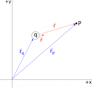 - Separation Distance - r is the scalar distance between the point charge and the location at which you want to know the electric field (Point P). In the equation, r is squared and inversely related to electric field, which means if you want the field at half the distance, the electric field is four times as large. You can find this distance using the separation vector $\vec{r}$ that points from the source charge to the observation location (Point P in this case); r is simply the magnitude of the separation vector $\vec{r}$. Mathematically you can calculate r from the positions of the charge and location of interest using: $$r=|\vec{r}|=|\vec{r}_{obs}-\vec{r}_{source}|=|\vec{r_{p}}-\vec{r_{q}}|$$