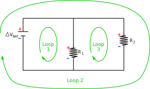 For a parallel circuit, using the loop rule becomes a little more involved, because now there are actually three different loops with the circuit. This means that we need to look at energy conservation around every loop in the circuit. To start, we will again mark which side of the resistors and battery would have a higher potential and which side would have a lower potential. For the first loop going clockwise, we see that there is a gain in potential from the battery and then a drop of potential across the resistor: $$+|\Delta V_{bat}| - |\Delta V_1| = 0$$ $$|\Delta V_{bat}|=|\Delta V_1|$$ For the second loop, we see the same with the second resistor: $$+|\Delta V_{bat}| - |\Delta V_2| = 0$$ $$|\Delta V_{bat}|=|\Delta V_2|$$ Finally for the third loop (again clockwise), we see a gain in potential across $R_1$ (moving from low to high potential) and a drop in potential across $R_2$ (moving from high potential to low). $$+|\Delta V_1|-|\Delta V_2| = 0$$ $$|\Delta V_1|=|\Delta V_2|$$