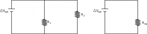 To simplify parallel circuits, we will again try to replace the resistors in parallel with a single resistor that has an equivalent resistance. We will still do this by comparing a circuit with two resistors in parallel to a circuit with a single equivalent resistor, keeping the $\Delta V_{bat}$ and $I_{bat}$ the same for both circuits. From the node rule in the two-resistor circuit, we know that: $$I_{bat}=I_1+I_2$$