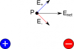 The figure on the right shows how the electric fields from the positive and negative charges combine at a single observation point to give the net electric field at that location. Remember electric field is a vector, so here the vertical components cancel out and the horizontal components add together. (This should make sense intuitively - if you add something that points up and to the right to something that points down and to the right you should be left with something that just points to the right.)