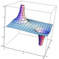 Sometimes, you may see the electric potential represented as a 3D contour map, where the x and y directions represent the space around the charge(s) and the z direction and/or color represents larger or smaller values of potential. For the dipole, this sort of contour map would look like the one to the right. In this picture, higher on the z-axis (or vertical) would mean a more positive electric potential and closer to the positive charge; whereas, negative on the z-axis would mean a negative potential and indicate that you are closer to the negative charge. Notice that there is somewhere in between that would have a zero electric potential, which comes from the addition of the potential from the positive and negative charges.