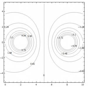 While the 3D contour maps are useful visualizations, they are rather cumbersome to draw without a computer. Instead, you may see potential represented as a 2D topographic map (kind of like a top view, looking down on the 3D contour version). In the 2D map, called an equipotential map or equipotential lines, the x and y directions again represent the space around the charge(s) and the lines represent the location where the electric potential is the same (this is where the word equipotential comes from). For the dipole, this equipotential map is shown to left. Notice that each of the lines is labeled with a number - this is the electric potential everywhere on that line. To the left of the zero line, the numbers are all positive and increase as you get closer to the center of the circle. This indicates that the positive charge of the dipole is in the center of the left circle. Similarly for the right circle, the potential lines are decreasing in potential indicating that this is where the negative charge of the dipole is.