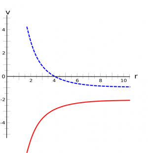 Potential vs Distance of a positive (dashed blue) and a negative (solid red) charge with the V=0 reference point at a non-infinite reference point.