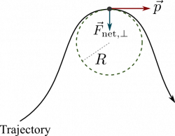where the unit vector, $\hat{n}$, always points inward towards the turn. For more general trajectories, the value of $R$ is the radius of curvature of the arc, that is, it is the radius of the circle that has exactly the same curvature at the location of interest.