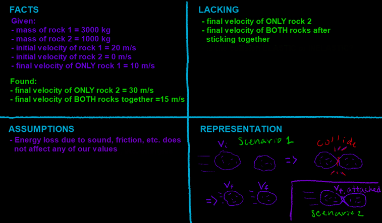 Two rocks are floating off in space. You've observed that the first rock has a mass of 3000 kg and an initial velocity of 20 m/s. The second rock has a mass of 1000 kg and no initial velocity. The two rocks collide; rock one hits rock two, leaving rock one with a velocity of 10 m/s.