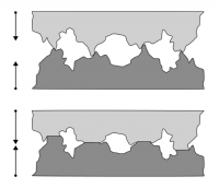 This coefficient of kinetic friction ($\mu_k$) takes values between 0 and 1 depending on the two surfaces in contact, with closer to 1 meaning greater friction (i.e., more action by the asperities; often rougher surfaces).