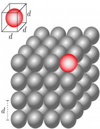 If the atoms are all lined up on a single edge, and we approximate their rough spherical shape by cubes with the same length as the atomic diameter (Figure to right), we can find the size of atoms along a 1m edge: