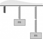 When we attach a second 100N/m spring to the end of the first and then attach the mass, both springs will stretch 1m. That is, the overall stretch of the spring-mass system is 2m.