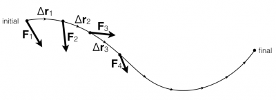 $$W_{total} = W_{1} + W_{2} + W_{3} + \dots = \vec{F}_{1}\cdot\Delta \vec{r}_{1} + \vec{F}_{2}\cdot\Delta \vec{r}_{2} + \vec{F}_{3}\cdot\Delta \vec{r}_{3} + \dots = \sum_{i=l}^N \vec{F}_i\cdot\Delta\vec{r}_i$$