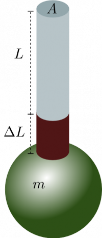 Hanging a mass on the end of a wire with relaxed length $L$ and cross-sectional area $A$ results in an elongation (stretch) $\Delta L$.