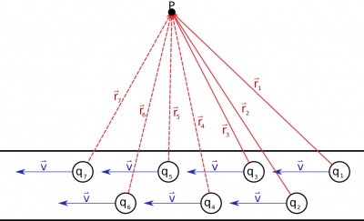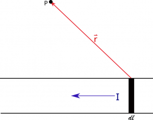 If we consider a straight wire with a steady current, there would be many moving charges everywhere in wire that would all contribute to the magnetic field outside of the wire. If we take a “snapshot” of what the wire would look like at any given time, there would be charges moving somewhat haphazardly through the wire. We continue to use the Drude model for these charges and assume that we can model the wire with each charge moving with some average constant velocity in the wire. The magnetic field at a point would then be the sum of the magnetic fields from each moving charge, each of which would be a different distance away from Point P: $$\vec{B}_{tot}=\frac{\mu_0}{4 \pi}\frac{q_1\vec{v}\times \hat{r_1}}{r_1^2}+\frac{\mu_0}{4 \pi}\frac{q_2\vec{v}\times \hat{r_2}}{r_2^2}+\frac{\mu_0}{4 \pi}\frac{q_3\vec{v}\times \hat{r_3}}{r_3^2}+...=\Sigma_i \frac{\mu_0}{4 \pi}\frac{q_i\vec{v}\times \hat{r_i}}{r_i^2}$$ Since we have many small charges that we are adding the field contributions from, we can turn the summation into an integral and the individual charges $q_i$ into $dq$: $$\vec{B}_{tot}= \int \frac{\mu_0}{4 \pi}\frac{dq \cdot \vec{v}\times \hat{r}}{r^2}$$ Again this equation just says that we are going to add together the magnetic field contributions at a point from every charge ($dq$) that is moving in the wire.