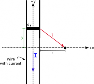 Let's look at a particular example of finding the magnetic field a distance $s$ away from a very long wire with some constant, steady state current I flowing from top to bottom. Since the wire is very long, we will assume for our purposes that it stretches from $+\infty$ to $-\infty$ in the y direction. If we start with the general magnetic field equation for a current, then we can start to fill in the pieces. $$\vec{B}_{tot}= \int \frac{\mu_0}{4 \pi}\frac{I \cdot d\vec{l}\times \hat{r}}{r^2}$$ We will plug in the $\hat{r}=\frac{\vec{r}}{r}$ definition and pull the constants (including $I$) out of the integral: $$\vec{B}_{tot}= \frac{\mu_0 \cdot I}{4 \pi} \int \frac{d\vec{l}\times \vec{r}}{r^3}$$ The $d\vec{l}$ is a little bit of length in the y-direction (just like what we did with electric field) but now it has a direction. Since the current goes from top to bottom, we would say the direction of the $d\vec{l}$ is down. So we can rewrite the $d\vec{l}$ as: $$d\vec{l}= \langle 0, -dy, 0 \rangle$$