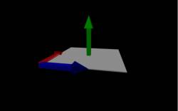 where $\Phi_{B}$ is the magnetic flux (with units of $T \cdot m^2$), $\vec{B}$ is the magnetic field and $\vec{A}$ is the area vector. The area vector in this case is the vector that has the same magnitude as the area (i.e. length times width for a rectangular area or $\pi r^2$ for a circular area) and has a direction that is perpendicular to the area, which is represented by the green arrow in the figure to the right. (This is exactly the same as with electric flux). You may notice that there are actually two different vectors that are perpendicular to the gray surface. We've drawn the green arrow in the $+y$ direction, but we could have also picked the vector that points in the $-y$ direction. For an open surface, it doesn't matter which of the perpendicular vectors you pick, as long as you are consistent after you pick one.