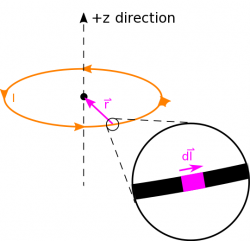 A coil is when a length of wire with current running through it has been wrapped around on itself creating some sort of shape as shown in the figure to the right. (You may also hear a coil referred to as a “current-carrying coil”, “a loop”, or “a ring”.) Typically, we will use circular coils because the mathematical calculations are easier for a circular coil, but you could also have a rectangular coil or some other shape. In these notes, we will focus on how to deal with the circular part of the wire, as we have already talked about how to calculate the magnetic field from current in a straight wire.