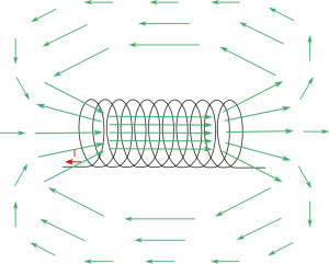 A solenoid is similar to a coil, but instead of having multiple loops of wire one on top of another, the loops are spread out (kind of like a slinky). An example of a solenoid is shown in the figure on the right. As the solenoid is composed of multiple, connected loops, this creates a strong magnetic field in the center of the solenoid, which becomes weaker and wraps around the outside of the solenoid. Because of the superposition of the magnetic field, the field inside the solenoid is actually constant both in magnitude and direction. This makes the solenoid a very important application as it is one of the primary ways that we can create a constant magnetic field on Earth.
