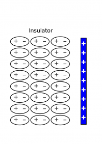 If instead you put a positive charge next to a neutral insulator, the electron clouds on the surface will be pulled toward the positive charge, causing the surface to have a small negative charge. Because the insulator is now polarized, there will be a small attraction between the positive and the insulator, even though it is electrically neutral overall. (The first few layers of atoms on the surface of the insulator are shown to the right with a positive charge.) This is why a charged balloon (that you rubbed on your hair) will stick to a wall, even though you did not do anything to charge the wall.