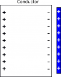 When you put a negative charge next to a conductor, like a piece of metal, the negative charge repels the free electrons (the electron sea). Since these electrons are free to move through the metal, they move as far from the negative charge as they can, which makes the opposite surface of the conductor negatively charged (shown in the figure to the right). At the same time, the surface closest to the negative charge is now lacking negative charges because all of the free electrons have been repelled. This leaves the right surface of the metal with a net positive charge. Because the negative charges are on far side of the metal, the attraction from the positive surface is much stronger than the repulsion from the negative surface, making the attraction between the conductor and negative charge much stronger than it was in the insulator.