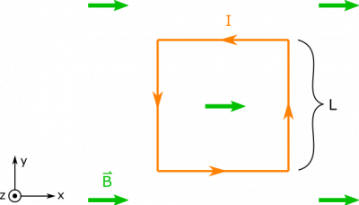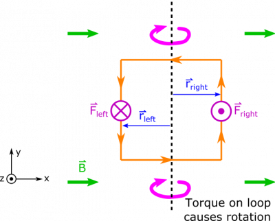 If we say the axis of rotation is in the middle of the loop, then $r_{left}$ and $r_{right}$ would both be $L/2$. We can also plug in what we just for the forces on the left and right sides of the loop. This will then give us the total torque on the loop. $$\vec{\tau} = \left(-\frac{L}{2} \hat{x}\right) \times \left(IBL \hat{z}\right) + \left(\frac{L}{2} \hat{x}\right) \times \left(-IBL \hat{z}\right)$$ $$\vec{\tau} = IBL^2 \hat{y}$$ This sort of rotating loop is the basis for an electrical motor. Essentially you are transferring electric energy (by providing a current through the loop) to kinetic energy (by making the loop spin).