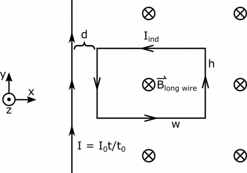 Suppose you have an increasing current through a long wire, $I(t) = I_0 \frac{t}{t_0}$. Next to this wire, there is a rectangular loop of width $w$ and height $h$. The side of the rectangle is aligned parallel to the wire so that the rectangle is a distance $d$ from the wire, and they are both in the same plane. What is the induced voltage in the rectangle? In what direction is the induced current in the rectangle?