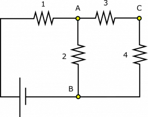 Suppose you have the following circuit. Resistors are labeled 1 through 4 and nodes in the circuit are labeled A, B, and C for convenience of reference. You know that the circuit contains a 12-Volt battery, $I_1 = 50 \text{ mA}$, $R_1=80 \Omega$, $R_3=300 \Omega$, $R_4=500 \Omega$, and $\Delta V_4=5 \text{ V}$. What are the potential differences $\Delta V_1$, $\Delta V_2$, $\Delta V_3$, and the resistance $R_2$?
