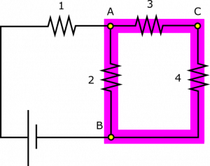 A couple applications of the Loop Rule should help us find the rest of the unknowns. Consider the loop highlighted in the circuit above. The Loop Rule – equation (4) – tells us that if we travel completely around the loop, we should encounter a total potential difference of 0. If we travel along the direction of conventional current (clockwise in our representation), voltage decreases, so $\Delta V_1$, $\Delta V_3$, $\Delta V_4<0$, whereas we have $\Delta V_{\text{bat}}>0$. These four potential differences form a loop, so they should add to 0: $$\Delta V_{\text{bat}}-\Delta V_1 - \Delta V_3 - \Delta V_4 = 0$$ We know enough potential differences to find the voltage across Resistor 1: $$\Delta V_1 = \Delta V_{\text{bat}}-\Delta V_3 - \Delta V_4 =4 \text{ V}$$