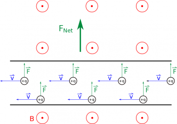 Note: that the force is still given by the cross product between the $d\vec{l}$ and the $\vec{B}$, so the force on the piece of wire is still perpendicular to both the direction of the moving charges ($d\vec{l}$) and perpendicular to the magnetic field ($\vec{B}$). This means we can still use the right hand rule to figure out the direction of the $d\vec{F}$.
