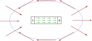 Given the analogy to Gauss' Law, you might think the approach is going to be similar - we integrate the magnetic field over an imagined closed surface area and that tells us something. Unfortunately, as far as a we know (and people are looking!), there are no single magnetic 'charges', termed 'magnetic monopoles.' That is, everywhere we look magnetic poles come in pairs - a north pole and a south pole. For example, if we think about enclosing a bar magnet with a Gaussian-like surface (an imaginary bubble), the magnetic flux through the whole bubble would be zero! For every magnetic field vector pointing into the bubble, there is also a magnetic field vector pointing out.