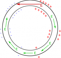 This is all well and good until we return to the top of the loop. At the top of the loop, there would be a large change in the surface charges (shown in Fig. 2 to the left), which would create an electric field that points in the opposite direction! (Remember electric fields point away from positive charges and towards negative charges.) This is very problematic and would not result in a constant current. On top of that, the drastic change from negatives to positives would imply that there's a large change in voltage at that spot. We were ok with this before because there was a battery at that location to justify that change in voltage, but now there's only a wire. It doesn't make sense for there to be a drastic change in voltage in only one spot in the wire. This tells us that it is NOT surface charges that are creating the electric field in this case. Something else must be creating an electric field that is driving the current in the loop.