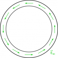 Because this is a curly electric field, which is very different than the other kinds of electric fields that we have talked about, we will write a curly electric field from a changing magnetic field as $\vec{E}_{nc}$. The “nc” is because this is referred to as the “non-coulombic” electric field, whereas we will keep $\vec{E}$ to be for an electric field from static charges.