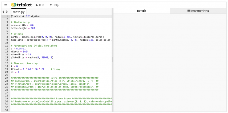 1. Run the code and see what happens! You should see a satellite shooting off into space, completely unaffected by gravity.
