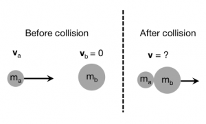 To make this more concrete, consider the situation to the left where a single object (A) is moving towards another single object (B). In this situation, A is moving to the right with a known speed ($v_A$) while object B is at rest. After the collision, which occurs over a short time, A and B are stuck together moving at an unknown speed ($v$).