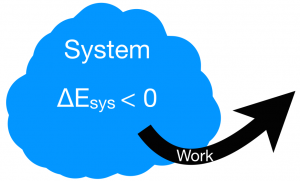 We observe that the total change in energy of a system and the system surroundings is zero. This means that whatever energy change we observe in the system, is exactly taken up by the surroundings. That is, if the system energy goes down, then the energy of the surroundings must go up.