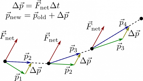 If you were to connect the straight lines in this picture, you would see a trajectory that looks more like moving through a curved trajectory. The time step here is quite long for the motion, but using a shorter time step, the line segments are shorter and more closely produce a curved trajectory.