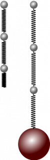 Consider a very thin wire that is one atom thick. In this case, you can observe what happens to each bond in the wire when a heavy ball is attached to the end of the wire (Figure to the left). In this case, each bond is “stretched” by roughly the same amount. This is the model to consider when you think “the tension is the same throughout the wire.”
