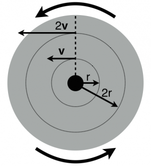 $$v(r) = \dfrac{2 \pi r}{T} = \dfrac{2 \pi}{T}r=\omega r$$