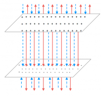 For example, in the figure to the left, red-solid arrows are representing the electric field from the positive plate of charge and blue-dashed arrows represent the electric field from the negative plate of charge. So we are using both the color and textures to distinguish the meaning of the arrows.