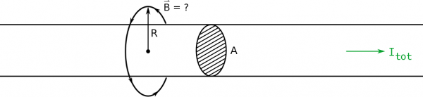 $$\oint \vec{B} \bullet d\vec{l} = \mu_0 I_{enc}$$ $$B \oint dl = \mu_0 I_{tot}$$ $$B 2\pi R = \mu_0 I_{tot}$$ $$ B =\mu_0\dfrac{I_{tot}}{2\pi R}$$