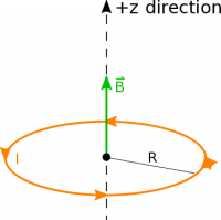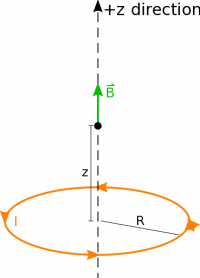 We could also calculate the magnetic field for an observation point at the center of the coil, but out of the plane of the ring (shown in the figure to the left). In this case, we would follow the same process as in the example; however, now the r-vector would have a z-component: $$\vec{B}=\frac{\mu_0 I}{2} \frac{R^2}{(z^2+R^2)^{3/2}} \hat{z}$$ Where $R$ is still the radius of the coil, $I$ is the current going around the loop, and $z$ is the distance away from the center of the loop. If you set $z=0$ (in other words you put the observation point back at the center of the coil), you get the same equation as above. Note this magnetic field is only true for an observation point at the center of the circular coil, but out of the plane of the ring - if you have a different observation point or a different shape of coil, this equation will no longer give you an accurate magnetic field.
