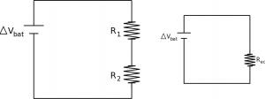 $$\Delta E_{sys} = W_{ext} + Q$$ $$\Delta E_{battery} + \Delta E_{resistor} = q\Delta V_{battery} + q\Delta V_{resistor} = 0$$ $$\Delta V_{battery} = -\Delta V_{resistor}$$