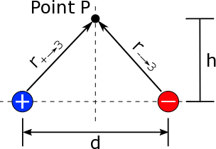 Similarly, we can find the electric field from the negative charge: $$ E_{-}=\frac{1}{4\pi\epsilon_0}\frac{q_{-}}{(r_{- \rightarrow P})^3}\vec{r}_{- \rightarrow P}$$ where $\vec{r}_{- \rightarrow P}= \langle -d/2, h,0 \rangle $ because it points from the negative charge to the location of Point P. In this equation, $r_{- \rightarrow P}$ is the magnitude of $\vec{r}_{- \rightarrow P}$ so $$r_{- \rightarrow P}=\sqrt{(-d/2)^2+h^2}=\sqrt{(d/2)^2+h^2}$$