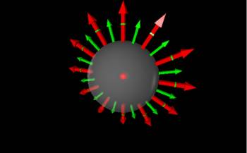Instead, imagine a spherical shell or bubble around the point charge. In this case, the $d\vec{A}$'s would point radially outward from the bubble at every point along the surface (again shown by the green vectors). Likewise, for every dA, the electric field points radially away from the point charge (shown by red arrows). This means that the $d\vec{A}$ is always perpendicular to $\vec{E}$ for a given location, so we can simplify the dot product to a simple multiplication. $$\Phi_e= \int \vec{E} \bullet d\vec{A} = \int EdA$$ Also, since the bubble has a set radius, everywhere along the surface has the same magnitude of the electric field. This means that E is constant along the surface (with respect to the surface area) so we can pull the E out of the integral. Then integrating dA over the whole surface, simply gives the surface area. $$\Phi_e = \int EdA=E \int dA = EA$$ In this case, E would be the magnitude of the electric field from a point charge at the radius of the shell. If we say that the radius of the shell is some distance c, then $r = c$. So we can write the electric from the point charge as: $$E = \frac{1}{4\pi\epsilon_0}\frac{q}{c^2}$$ and A would be the surface area of a sphere with a radius of $r=c$. $$A= 4\pi c^2$$ Putting those together we find the electric flux through the sphere to be: $$\Phi_e = EA =\frac{1}{4\pi\epsilon_0}\frac{q}{c^2}4\pi c^2$$ $$\Phi_e = \frac{q}{\epsilon_0}$$ (This equation then says that the electric flux through the spherical shell is equal to the charge inside the spherical bubble divided by a constant, which is Gauss's Law.)