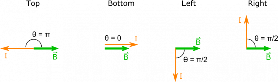 \[ \left| \vec{F} \right| = \begin{cases} IBL\sin \pi = 0 & \text{top} \\ IBL\sin 0 = 0 & \text{bottom} \\ IBL\sin \frac{\pi}{2} = IBL & \text{left} \\ IBL\sin \frac{\pi}{2} = IBL & \text{right} \\ \end{cases} \]
