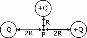 Suppose we have a distribution of point charges in a plane near a point $P$. There are three point charges: Charge 1 with charge $-Q$, a distance $2R$ to the left of $P$; Charge 2 with charge $Q$, a distance $R$ above $P$; and Charge 3 with charge $Q$, a distance $2R$ to the right of $P$. Find the electric potential and the electric field at the point $P$.